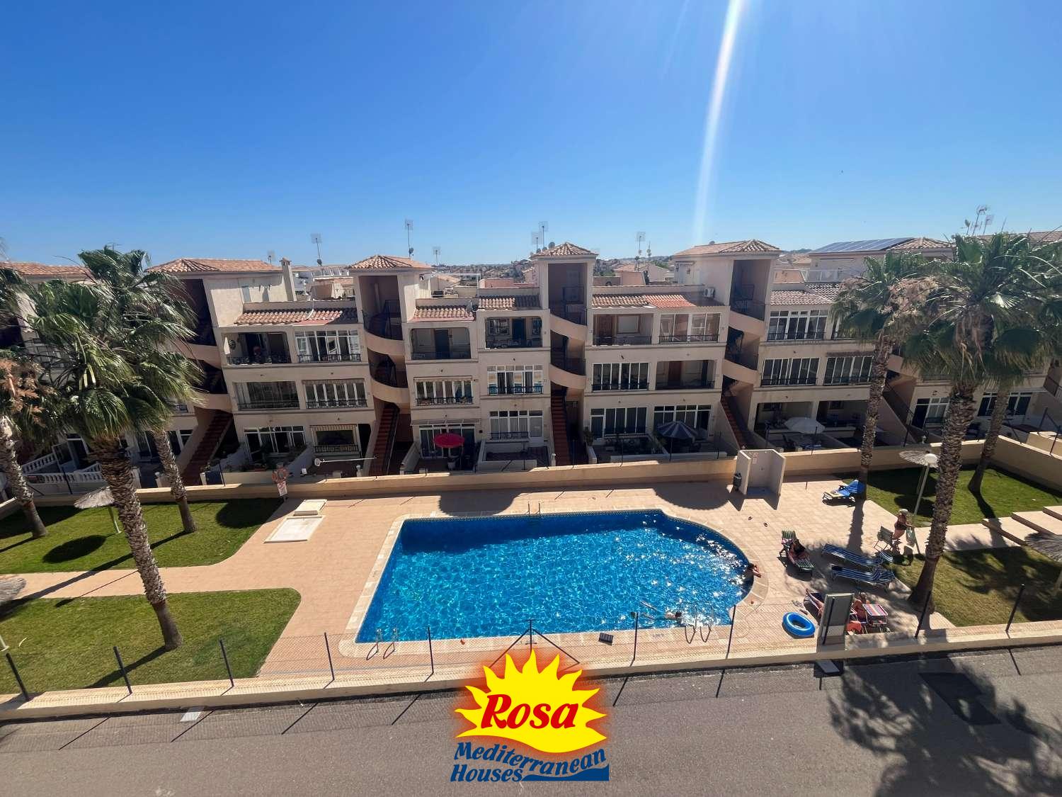 La propiedad disfruta de unas vistas preciosas con dos piscinas comunitarias muy bien mantenidas, proporcionando un entorno tranquilo y atractivo. Una característica destacada es la terraza cerrada, que ofrece espacio habitable adicional ideal para relajarse o cenar durante todo el año.